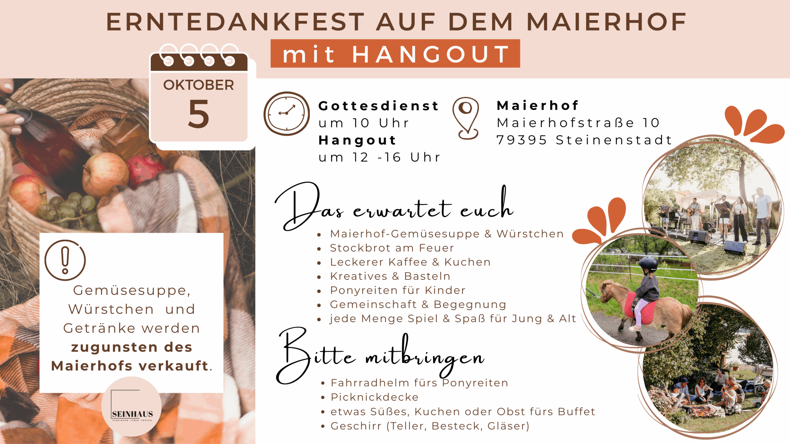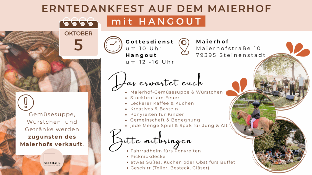 Euch erwartet ein Gottesdienst voller Dankbarkeit, ab 12 Uhr Mittagessen mit Maierhofsuppe mit Grillwürstchen, ein leckeres Kuchenbuffet, Café, Getränke usw. alles zu Gunsten des Maierhofs. Parallel dazu gibt es viele Angebote für Jung und Alt, Zeit für Gemeinschaft, zum Gegenseitigen Kennenlernen uvm.