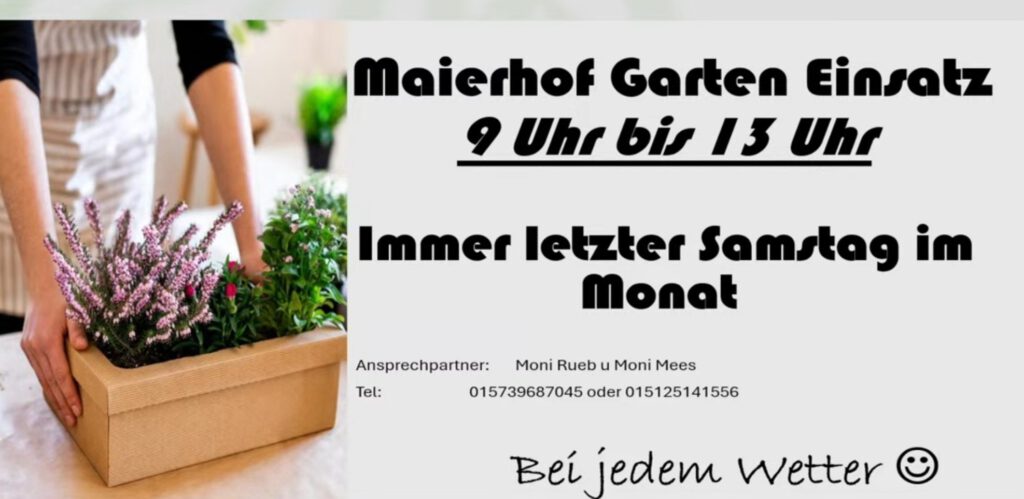 Hast Du Freude an Gartenarbeit? Dann laden wir Dich herzlich zu den monatlichen Garteneinsätzen auf dem Maierhof ein, um den Innenhof zum Blühen zu bringen!